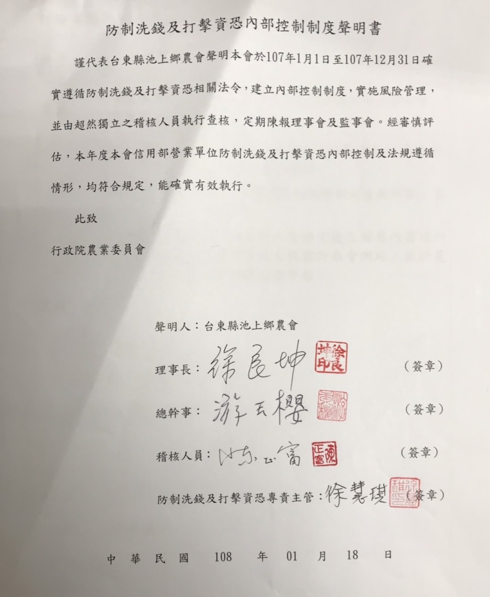 池上鄉農會防制洗錢及打擊資恐內部控制制度聲明書