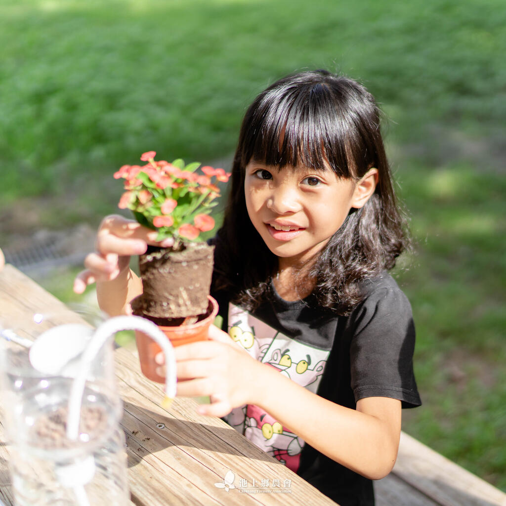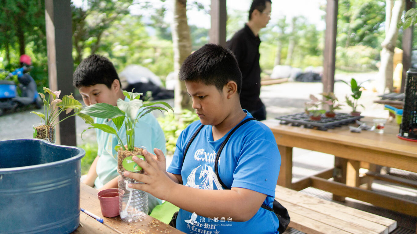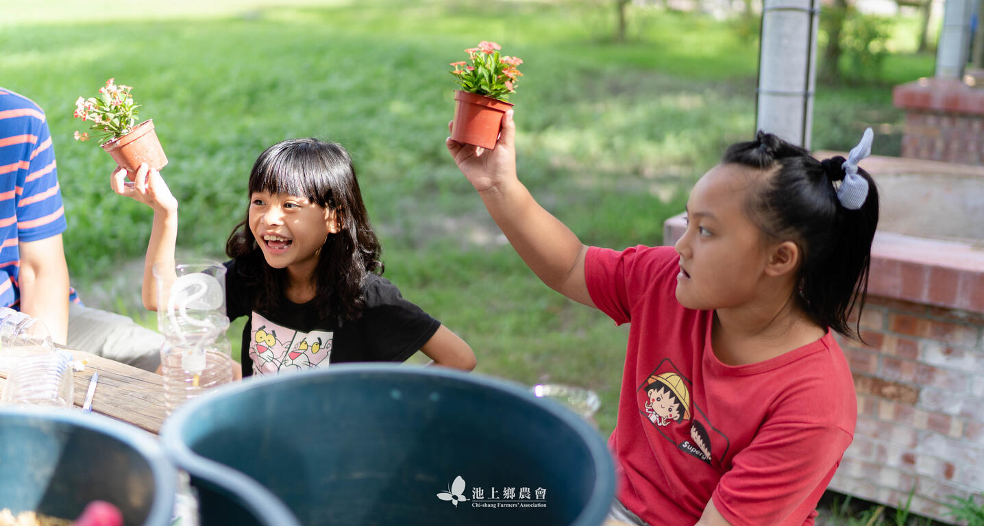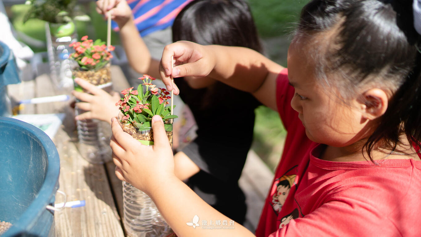 在池上鄉農會食農教育棚內,利用米廠產出的粗糠製作成的堆肥,讓小朋友從堆肥的原理開始到認識作物的扦插、移植,製作成療癒身心的小盆栽,小朋友們都玩得不亦樂乎呢!