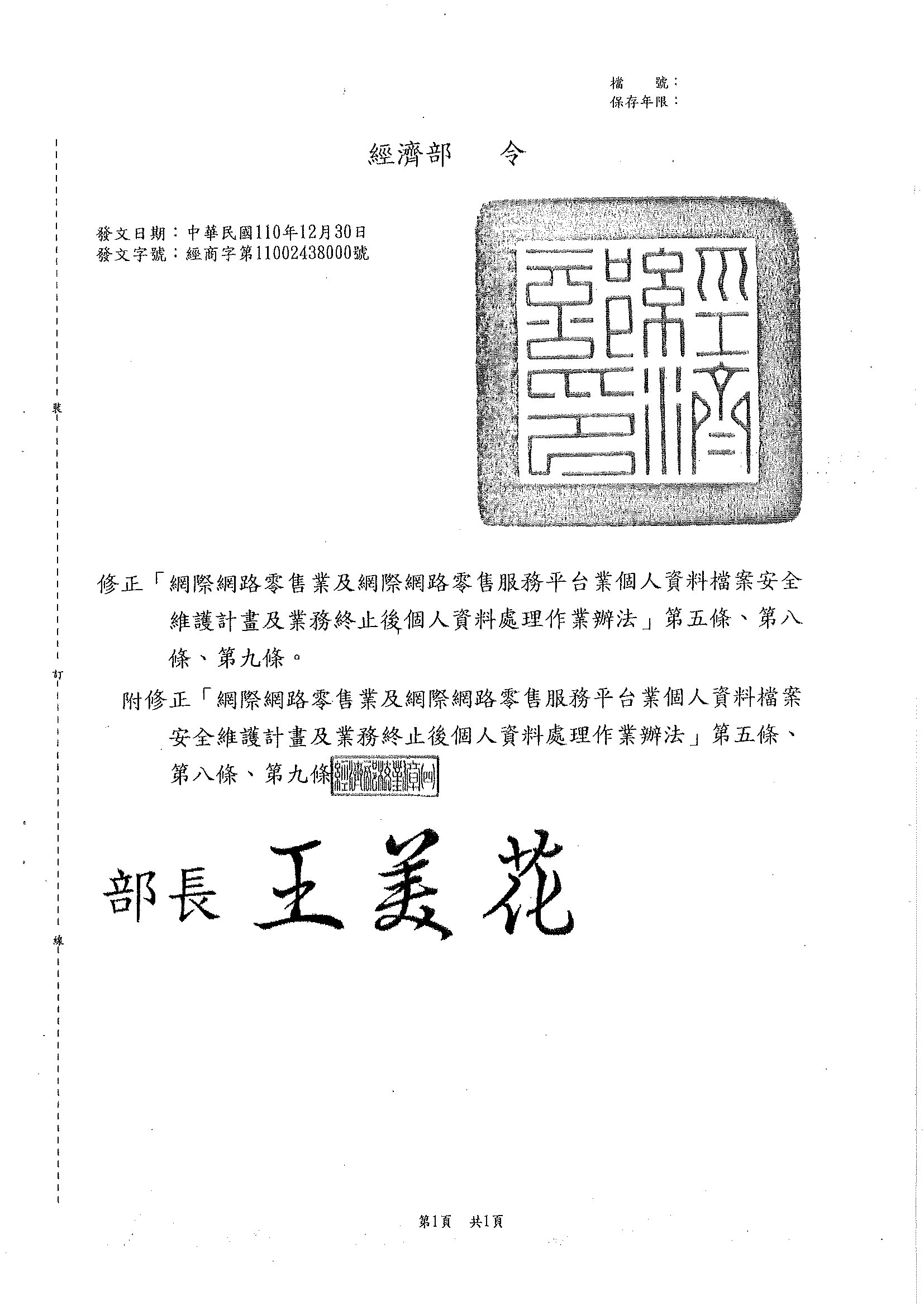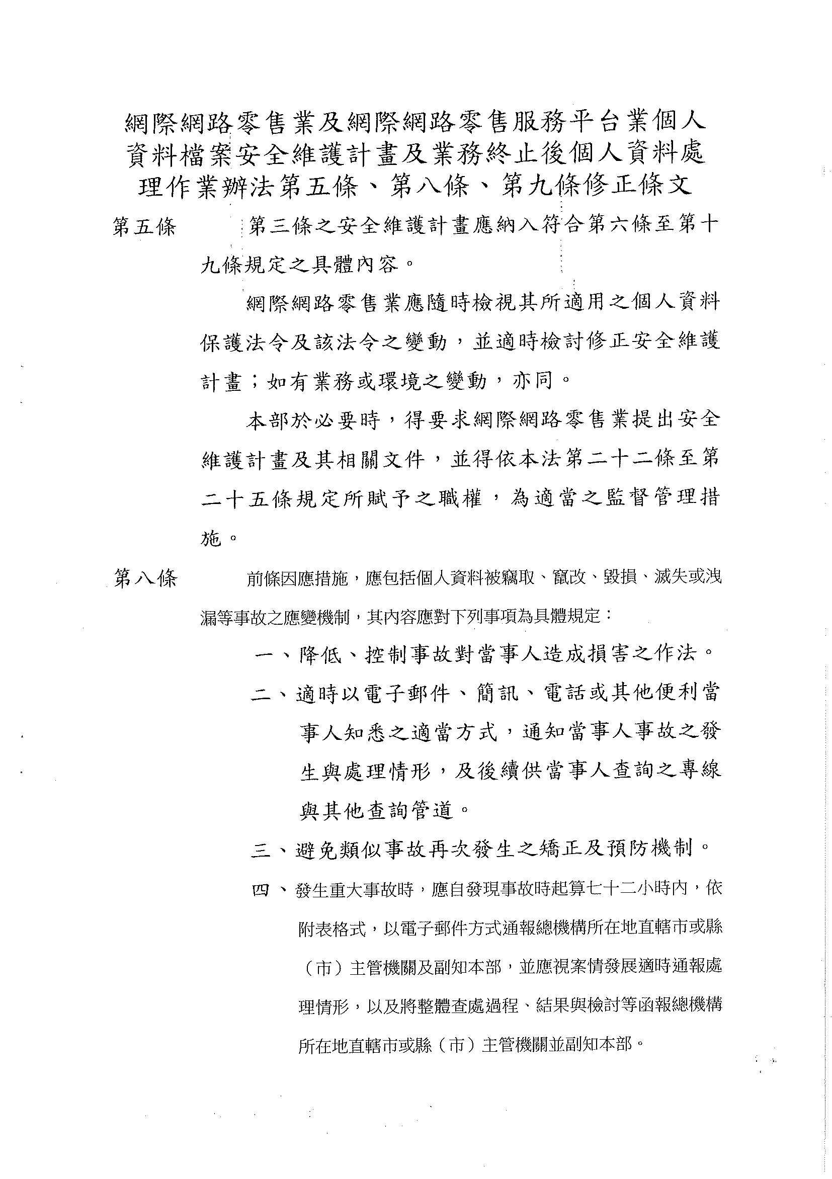 公告經濟部修正「網際網路零售業及網際網路零售服務平台業個人資料檔案安全維護計畫及業務終止後個人資料處理作業辦法」第五條、第八條、第九條條文
