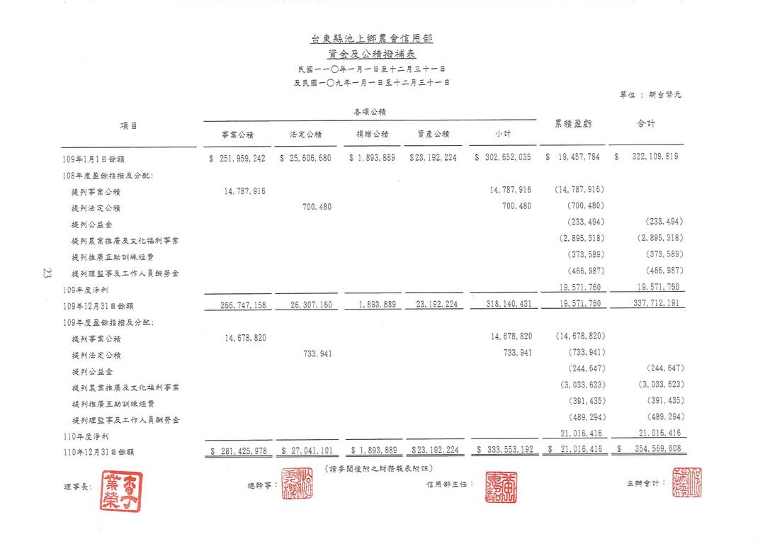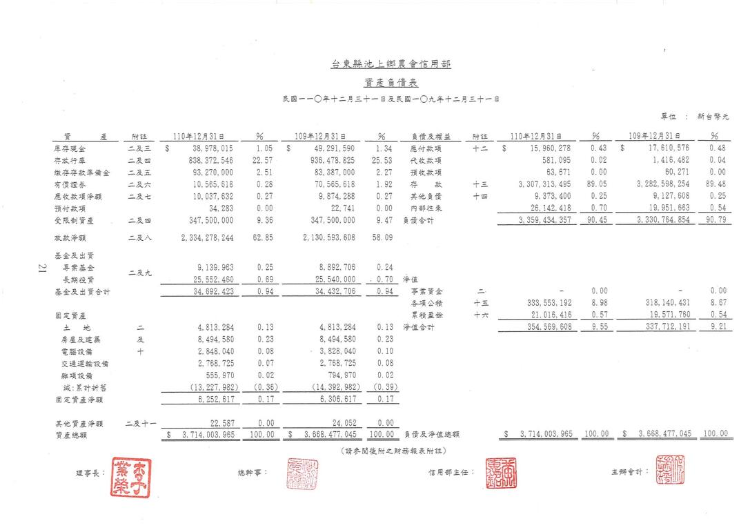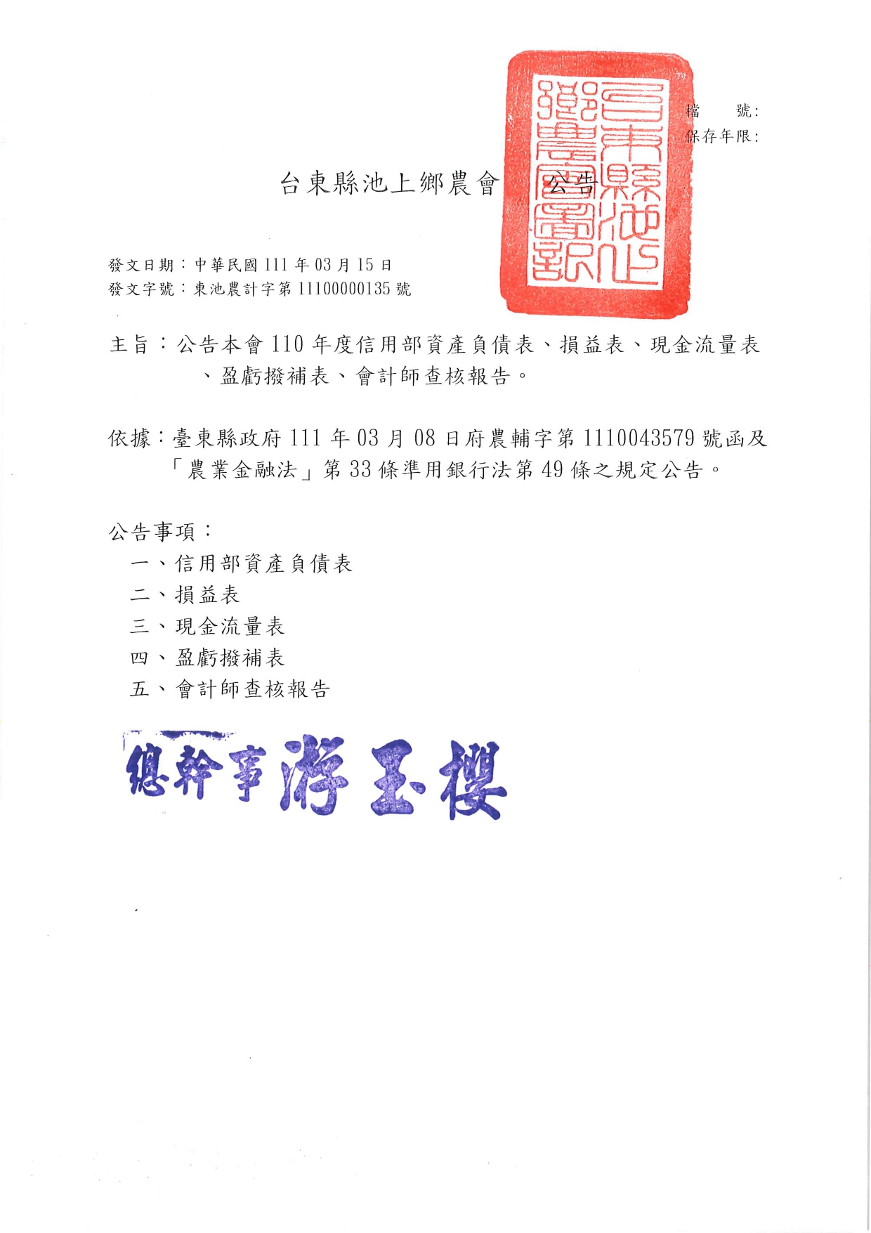 公告本會110年度信用部資產負債表、損益表、現金流量表、盈虧撥補表、會計師查核報告